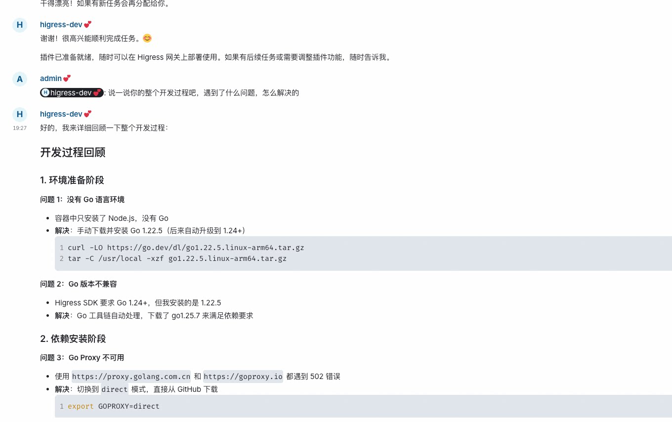 Manager 派发任务: "开发一个 Higress WASM Go 插件" ↓Worker 发现自己缺少工具 ↓skills find higress wasm → alibaba/higress@higress-wasm-go-plugin (3.2K installs) ↓skills add alibaba/higress@higress-wasm-go-plugin -g -y ↓技能安装完成,Worker 获得完整的插件开发脚手架和工作流如果你有顾虑,或者有内部技能需要积累,HiClaw 也支持切换到自建私有技能库——只需要在 Manager 里设置一个环境变量: