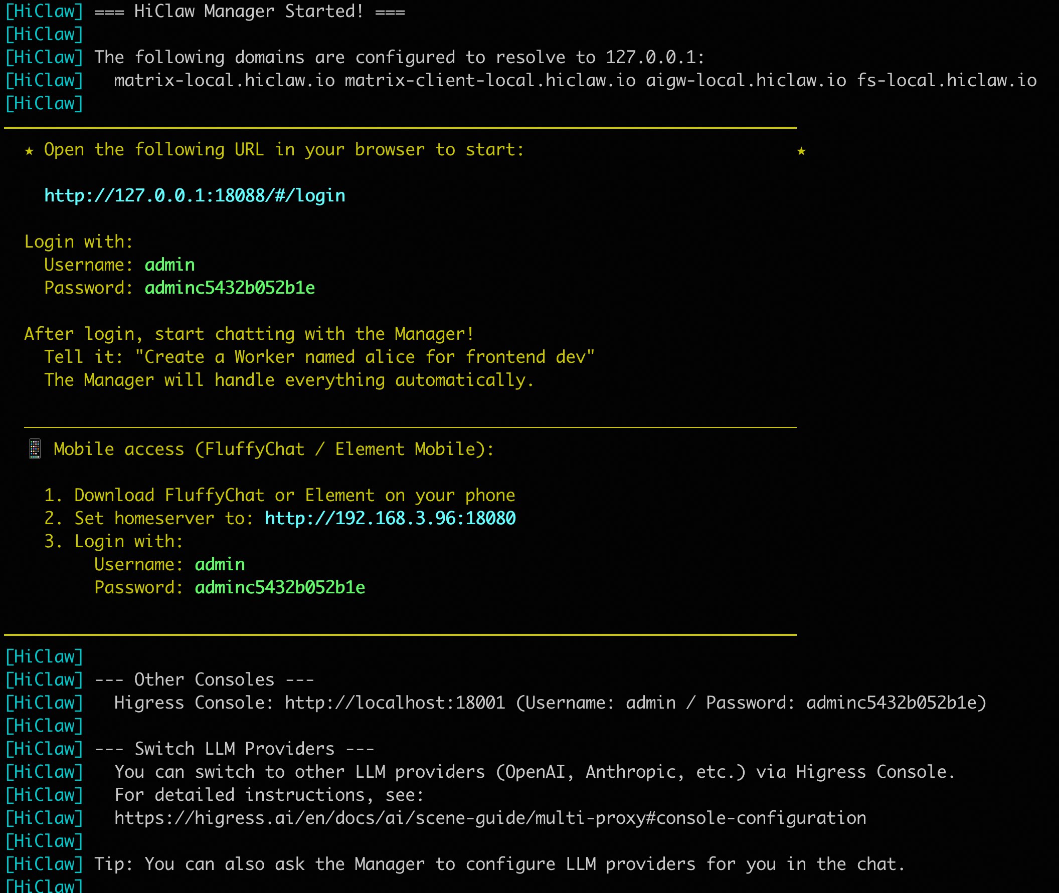 ┌────────────────────────────────────────────────────────────────────┐│ HiClaw All-in-One ││ ┌──────────────────────────────────────────────────────────────┐ ││ │ OpenClaw (pi-mono) │ ││ │ 中枢神经系统 │ ││ └──────────────────────────────────────────────────────────────┘ ││ ↑ ↑ ││ ┌────────────────┐ ┌────────────────┐ ││ │ Higress AI │ │ Tuwunel │ ││ │ Gateway │ │ Matrix │ ││ │ (大脑接入) │ │ Server │ ││ │ │ │ (感知器官) │ ││ │ 灵活切换 │ │ │ ││ │ LLM供应商 │ │ Element Web │ ││ │ 和模型 │ │ FluffyChat │ ││ └────────────────┘ │ (自带客户端) │ ││ └────────────────┘ │└────────────────────────────────────────────────────────────────────┘LLM 接入:Higress AI Gateway