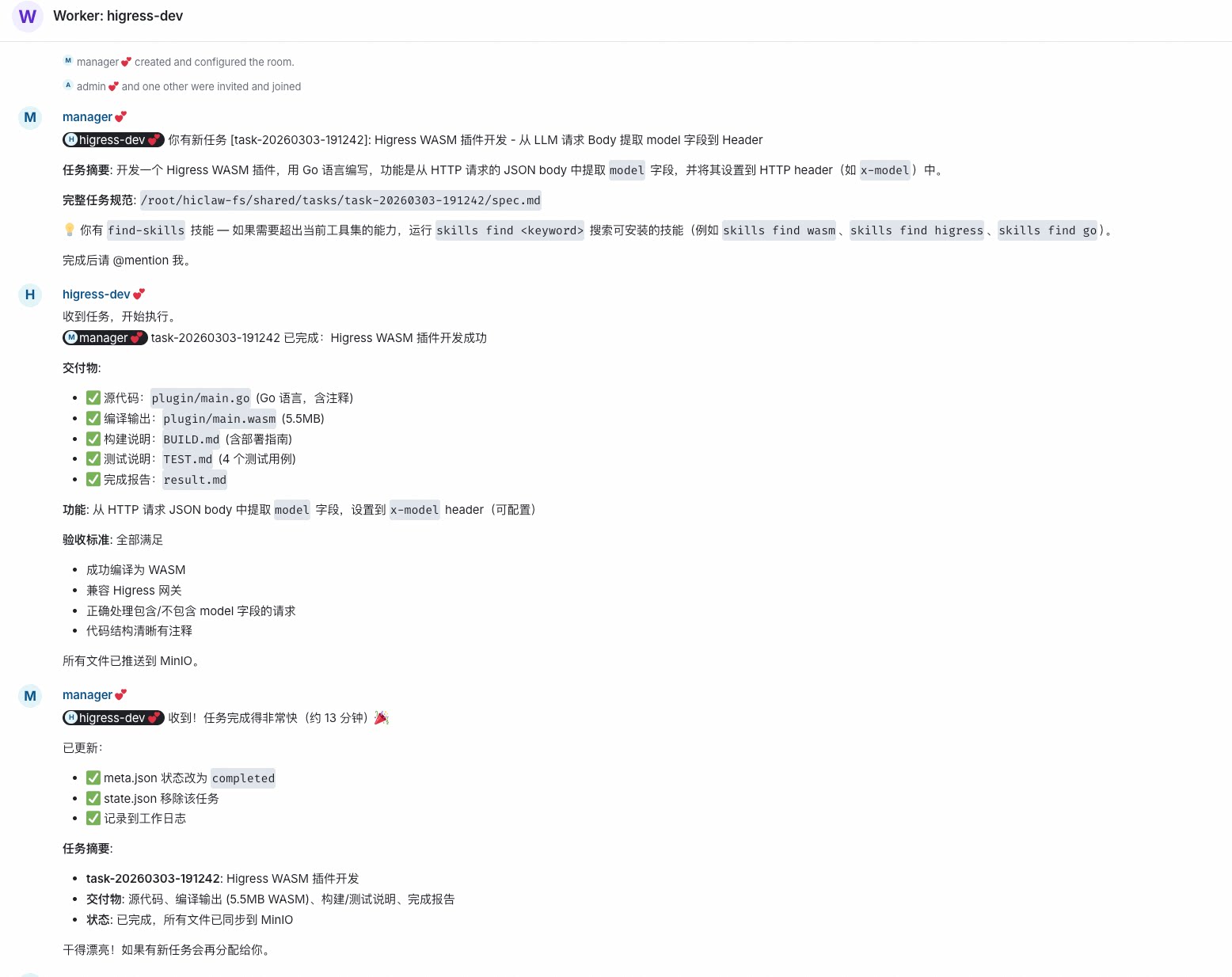 - 所有对话可见:你、Manager、Worker 在同一个 Room,全程透明。