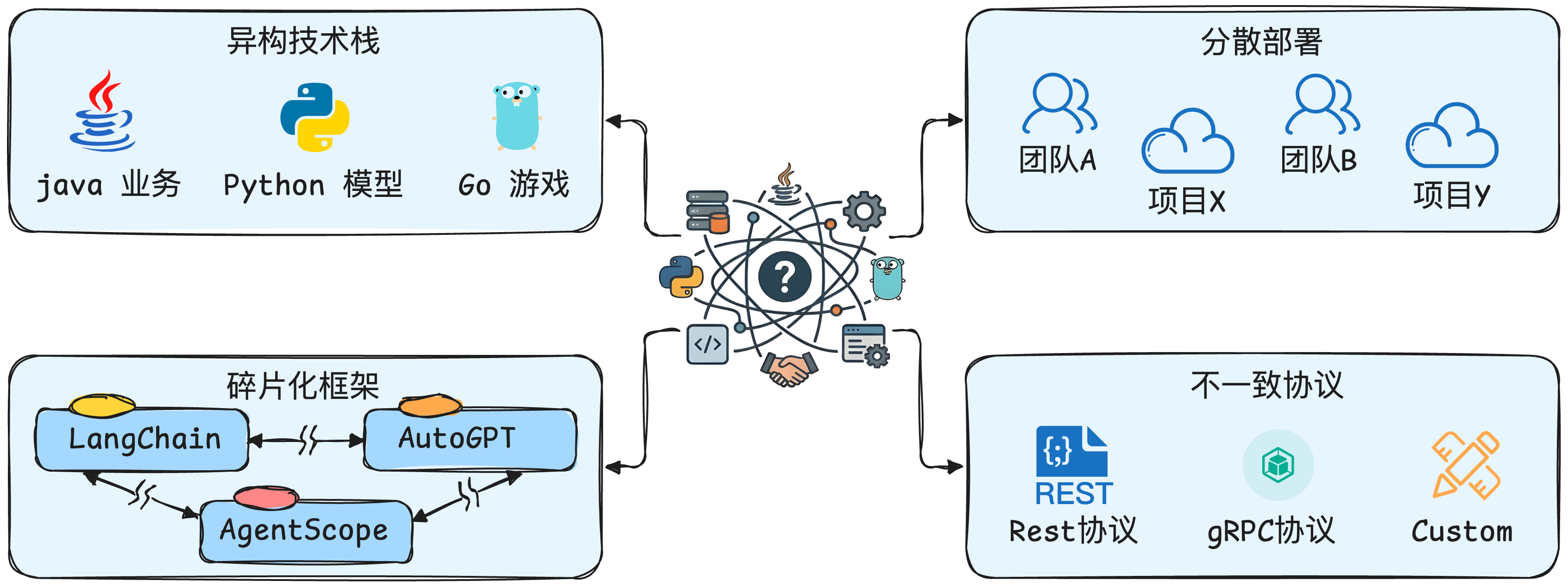 - 协议不统一: REST、gRPC、自定义协议…每个 Agent 都有自己的接口规范,集成成本高、维护困难。