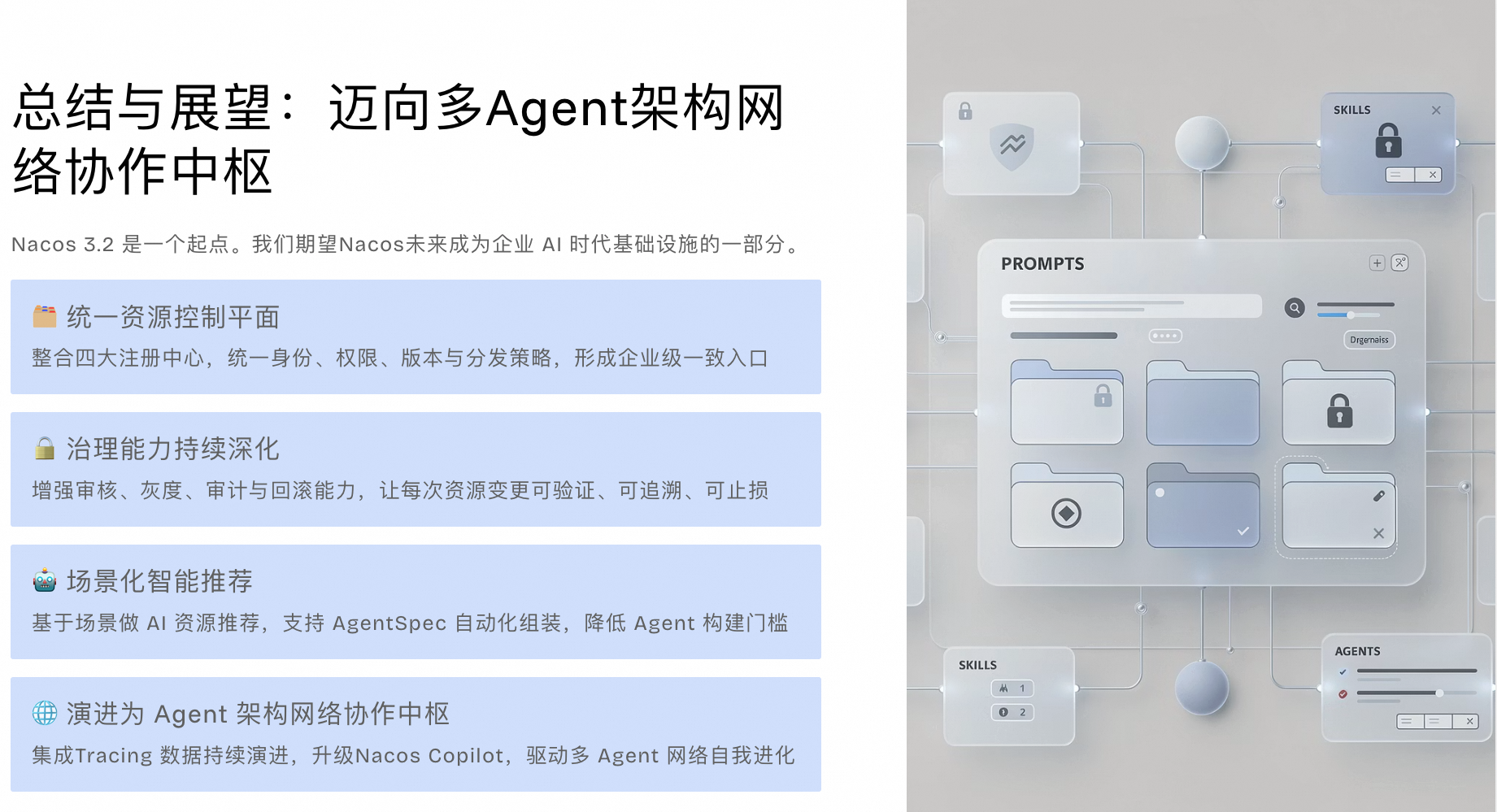 我们期望未来Nacos成为企业 AI 时代的资源治理基础设施一部分,成为多Agent架构网络的协作中枢。