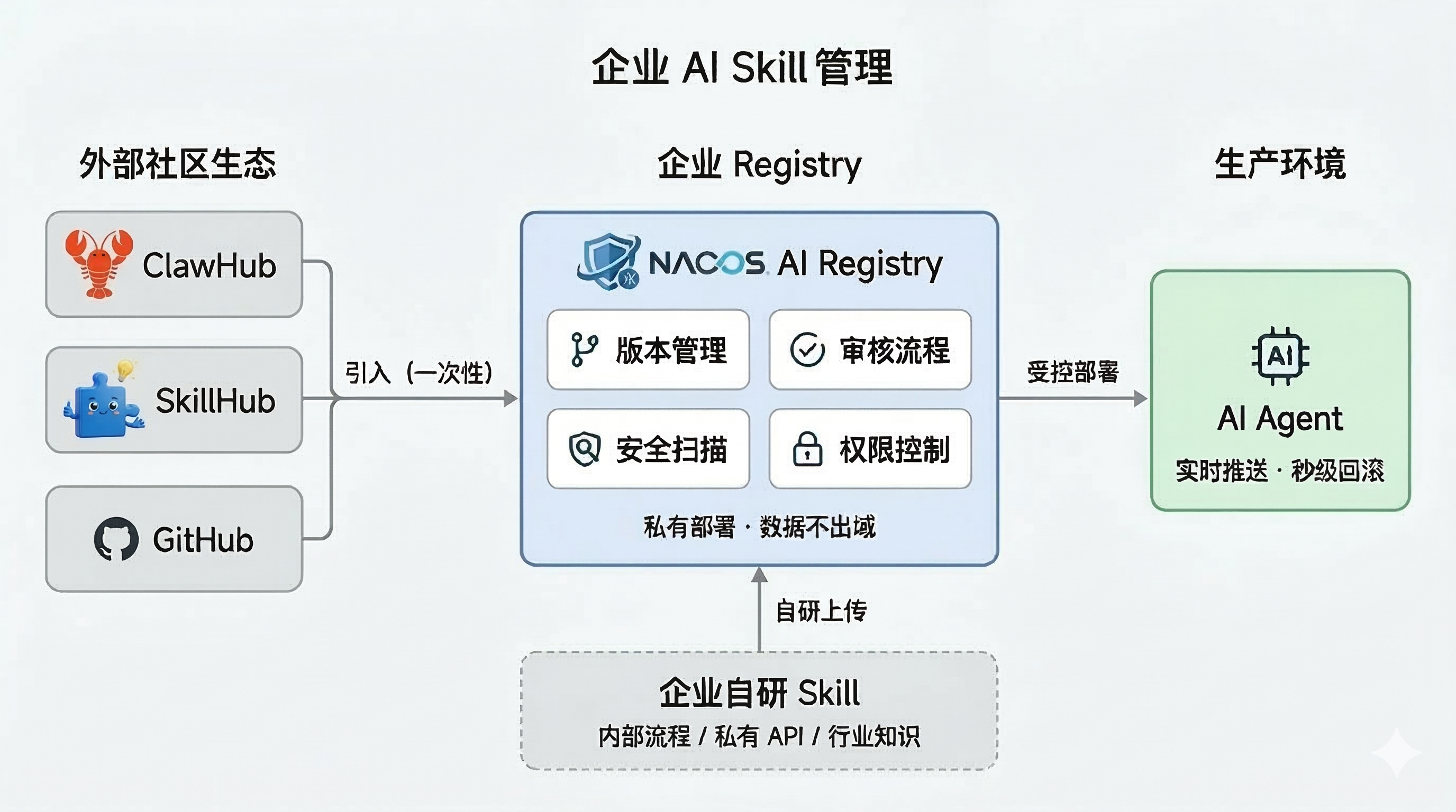 从社区发现了好用的 Skill?可以引入。但引入之后,它应该进入企业自己的注册中心,由自己管理——和外部平台彻底解耦。ClawHavoc 的安全风暴,都不应该影响到你的生产环境。